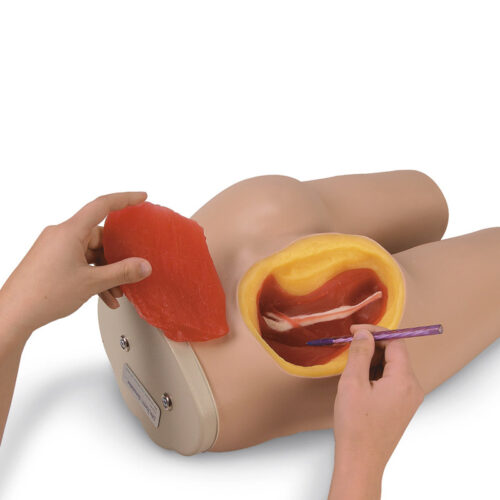 Simulador de torso inferior de un adulto para prácticas de inyección intramuscular. Simula un torso inferior de adulto en escala, apariencia, y textura real con estructura ósea simulada, imitando el extremo superior del fémur o trocánter mayor, las espinas ilíacas, anterosuperior y posterosuperior y el sacro. Cuenta con marcas anatómicas palpables para identificar sitios de inyección adecuados. Una sección del cuadrante superior externo del área del glúteo izquierdo se quita para visualizar las estructuras subyacentes. Los músculos glúteos medio y máximo, el nervio ciático y las estructuras vasculares se ven con claridad. Permite enseñar y practicar tres tipos de inyecciones intramusculares: dorso-gliteal, ventrogluteal, y vastus lateralis. La textura de tejidos simula la sensación real de inyecciones. -