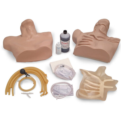Torso simulador para prácticas de neumotórax. Simula en tamaño y textura real el torso de un adulto para realizar prácticas de inserción de aguja para dejar que la presión de aire escape del tórax. Permite realizar prácticas de toracotomía en el segundo espacio intercostal en la línea clavicular media o en el quinto espacio intercostal en la línea axilar media. Cuenta con pulmones reemplazables, caja torácica y piel suave reemplazable. Su piel permite ser pinchada entre 75 y 100 veces antes de ser reemplazada. -