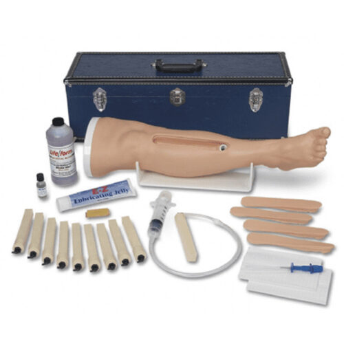 Simulador de pierna para prácticas de punción intraósea en adultos. Reproduce en tamaño, apariencia y textura real la pierna inferior de un adulto. Sirve para realizar prácticas de punción intraóseas y para resaltar el entrenamiento y comprensión de los procedimientos asociados con equipos B.I.G. y EZ-IO. No utiliza líquidos y no permite la administración de fluidos. Cuenta con tibias y pieles reemplazables.