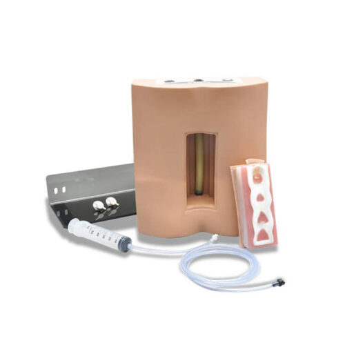 Torso simulador para demostraciones y prácticas de inyección espinal. Reproduce en tamaño, apariencia, y textura real el torso inferior posterior de un adulto. Las técnicas permitidas incluyen anestesia, punciones, analgesia epidural, analgesia caudal y bloqueo de los nervios sacro y lumbar simpático. Su columna vertebral y piel son reemplazables. Cuenta con la resistencia adecuada para la punción y palpación exacta. Las secciones L1 y L2 de la columna son claramente visibles. La sección incluye las vértebras L3 y L5 más el sacro y el cóccix. La columna se puede cargar con fluidos. -