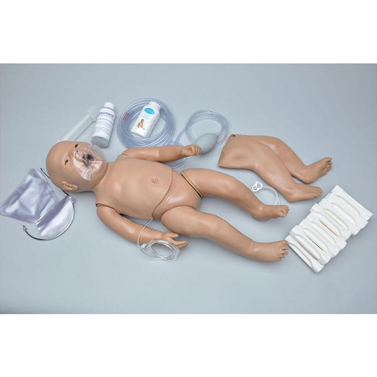 Simulador neonatal de cuerpo completo diseñado para la práctica de RCP y manejo de la vía aérea en recién nacidos. Permite entrenar ventilación, compresiones torácicas y palpación de pulso.