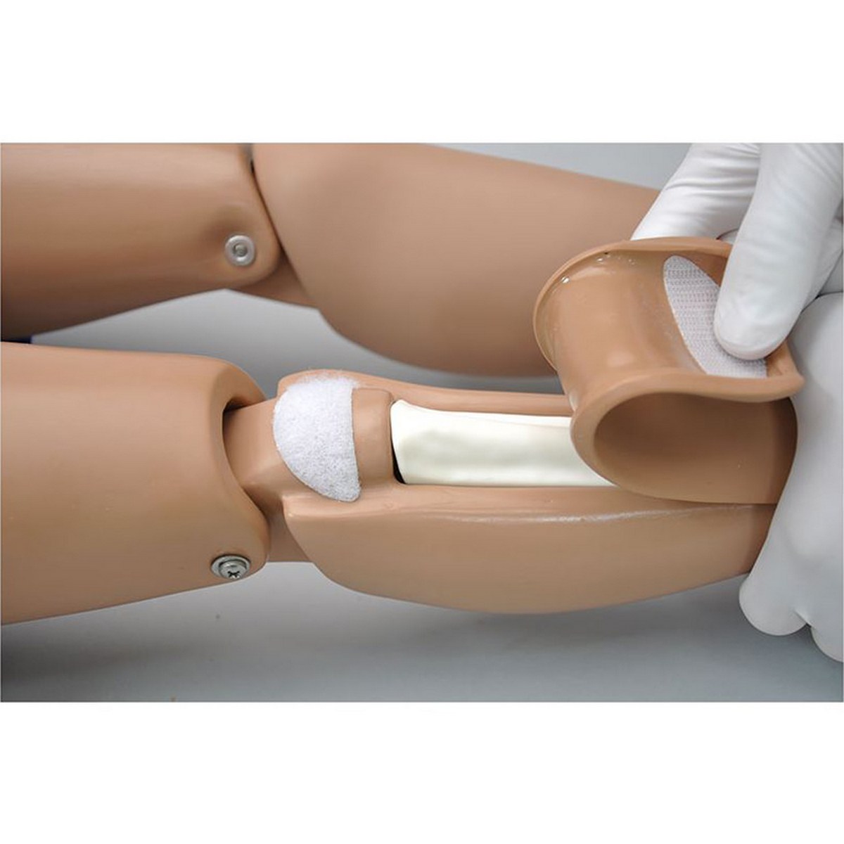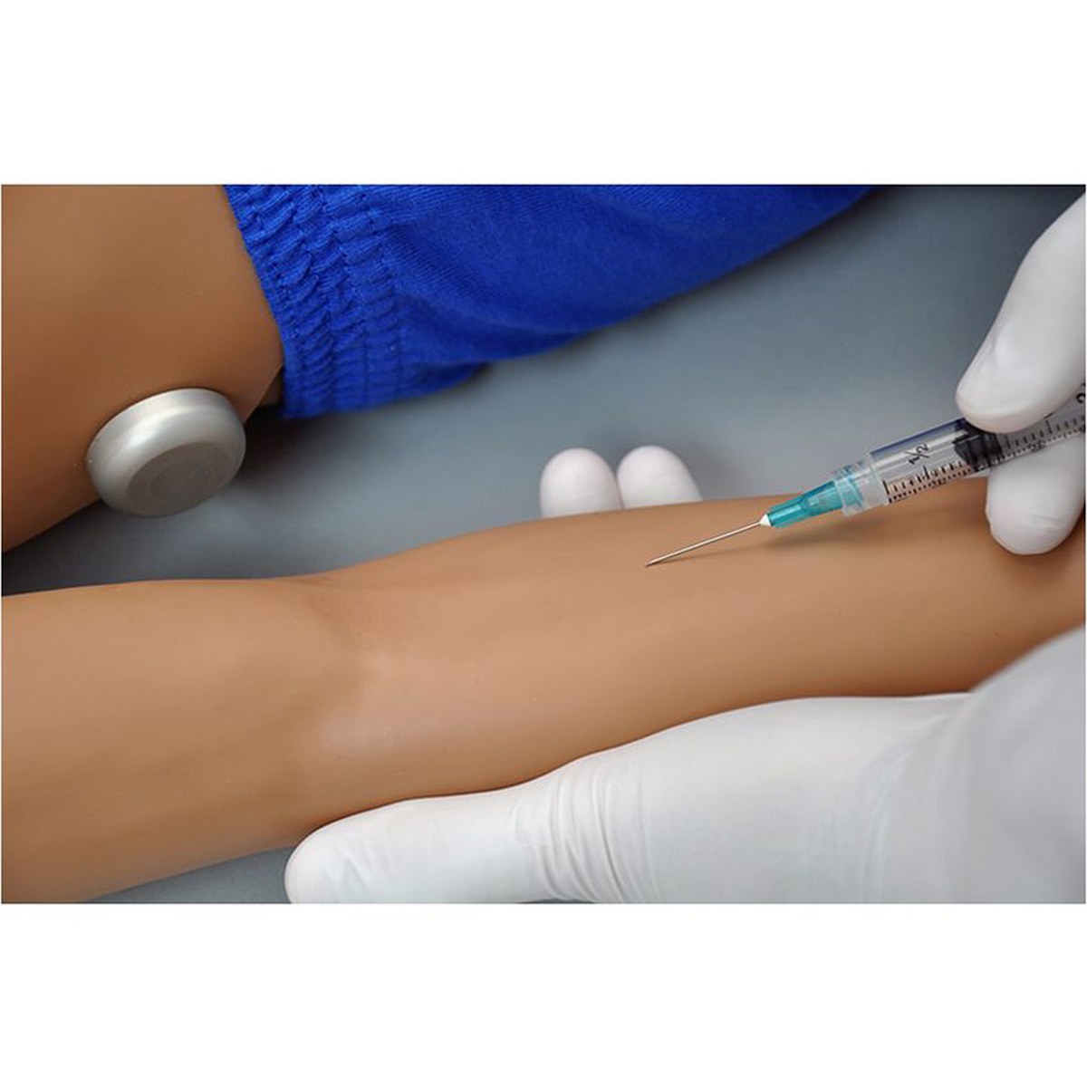 Sistema para infusión e inyección intraósea con tibia realista. Permite administrar fluidos, sangre y/o fármacos directamente en la médula ósea tibial.