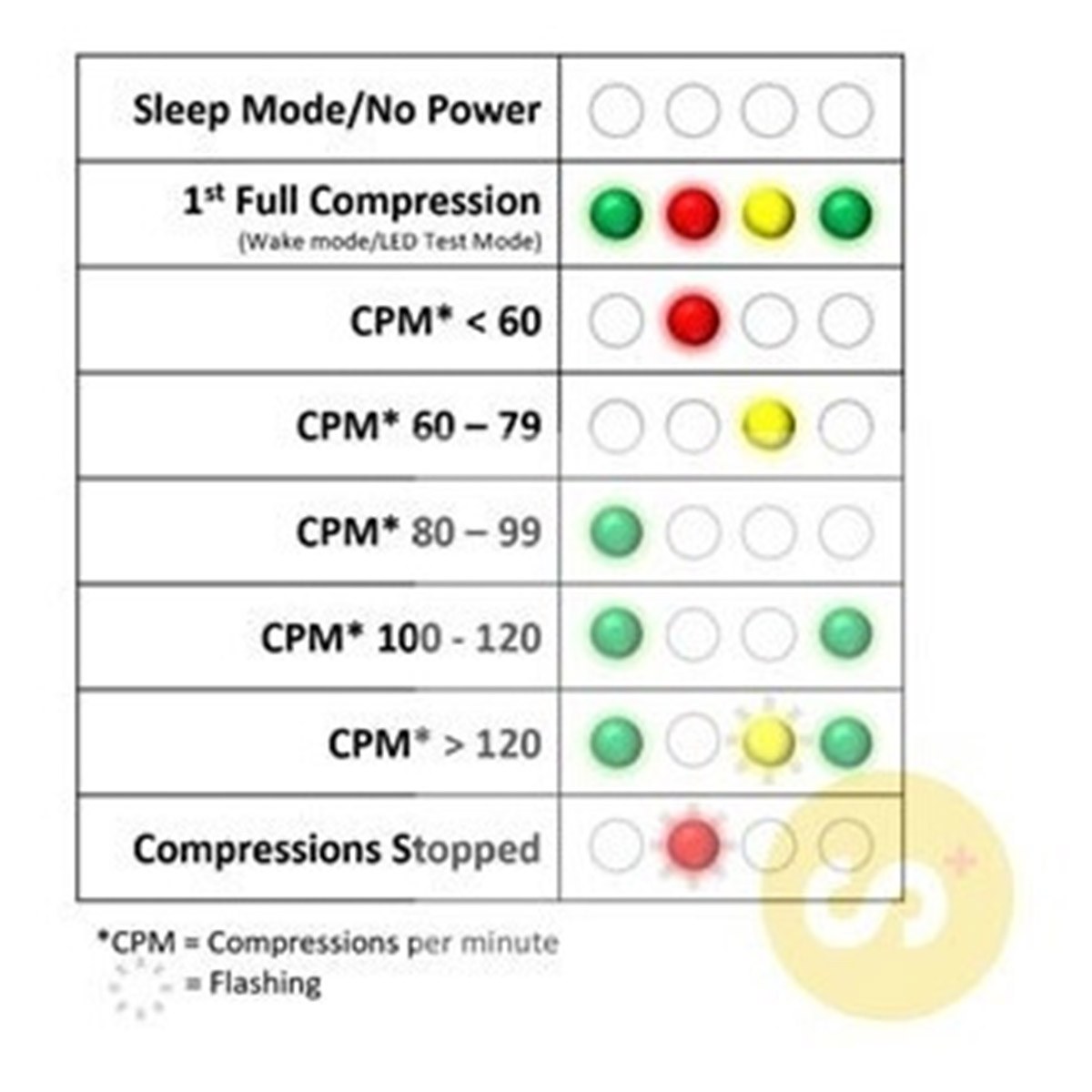 Mantiene el monitor visual de frecuencia de RCP con retroalimentación instantánea de ritmo y profundidad. Las luces indican si las compresiones se encuentran dentro del rango recomendado de 100 a 120 cpm, con alerta amarilla intermitente si se supera el límite. Además, emite un clic audible al alcanzar la profundidad adecuada (2,0 a 2,4 pulgadas).