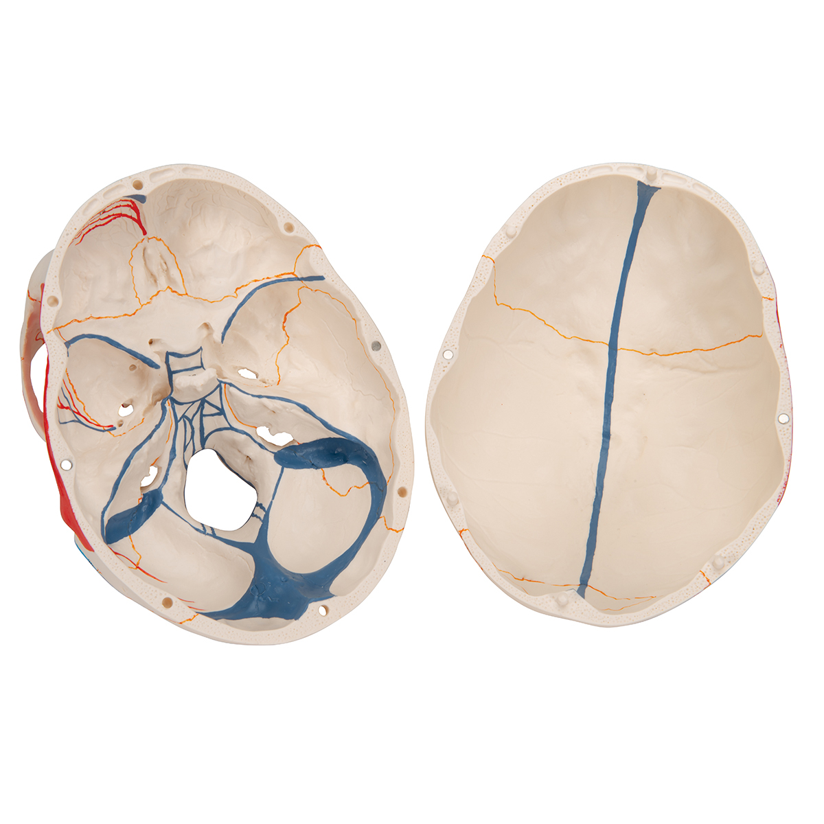Modelo de cráneo humano con origen muscular (rojo) e inserciones (azul) representadas en la mitad izquierda, ideal para el estudio anatómico funcional. Ofrece una reproducción muy exacta, fabricada y terminada manualmente con material resistente e irrompible, con gran detalle en surcos, orificios, apófisis y suturas. Es desmontable en bóveda craneal, base del cráneo y mandíbula, y admite opcionalmente un cerebro TB1000226 de 5 piezas. Incluye acceso al gemelo digital en smartphone, tablet o computadora. Dimensiones: 20 x 13,5 x 15,5 cm