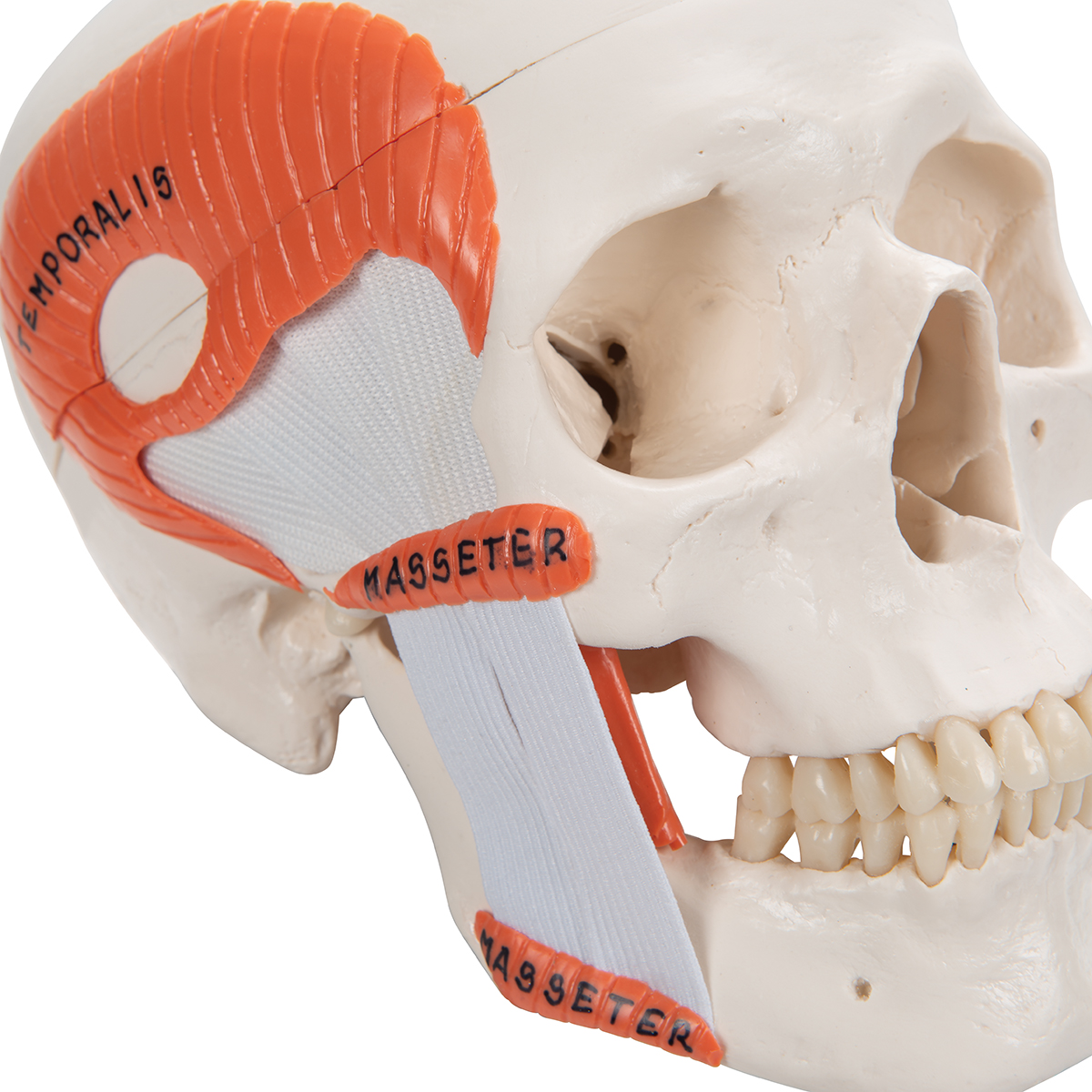 Los músculos de la masticación (masetero, temporal y pterigoideos interno y externo) se representan mediante bandas elásticas, lo que permite demostrar la función masticatoria con la mandíbula abierta y cerrada, así como los movimientos laterales y de protrusión. La bóveda craneal es desmontable en dos piezas. Modelo fabricado y terminado manualmente con material resistente e irrompible, con reproducción anatómica muy exacta. Incluye acceso al gemelo digital en smartphone, tablet o computadora. Dimensiones: 23.2 x 16.7 x 16.7 cm