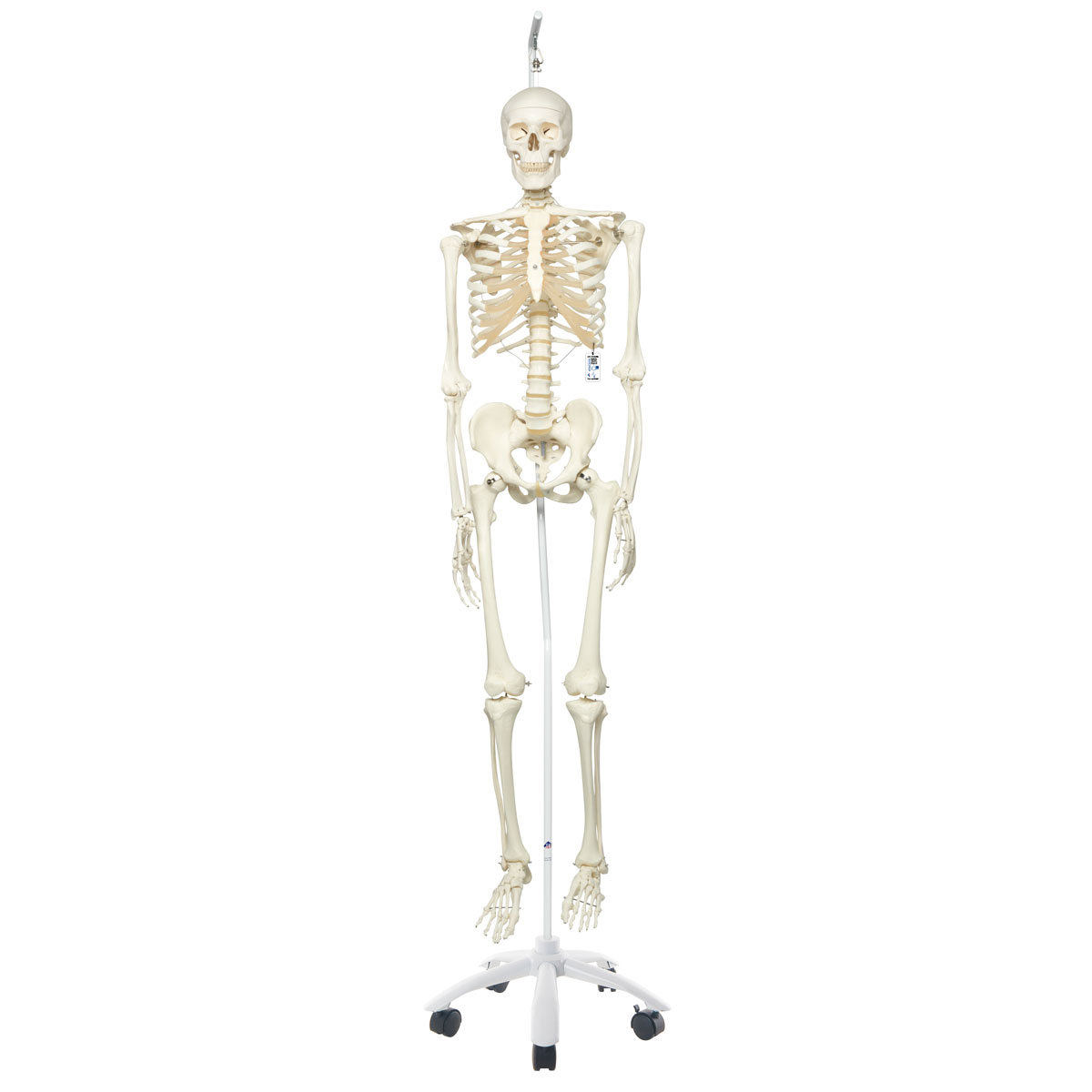 Esqueleto humano de tamaño natural, con aproximadamente 200 huesos y peso similar al real. Incluye cráneo desmontable en tres piezas con dientes montados individualmente. Los miembros pueden retirarse fácilmente para su estudio. Fabricado en plástico resistente y montado sobre pie metálico con cinco ruedas. Disponible con montaje en pelvis o colgante. Incluye funda protectora transparente y acceso al gemelo digital 3B Scientific®. Altura: 176,5 cm.