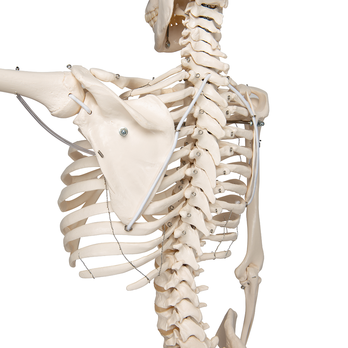 Esqueleto humano de tamaño natural con articulaciones de mecánica altamente realista. Permite demostrar rotaciones de miembros, flexión y extensión de rodilla y codo, y movimientos completos de la columna vertebral. Manos montadas sobre alambres y pies con montaje flexible. Escápulas, sacro y pelvis con movilidad funcional. Se entrega con pie metálico con 5 ruedas y funda guardapolvo transparente. Incluye acceso al gemelo digital 3B Scientific® en smartphone, tablet o computadora. Altura: 192,5 cm.