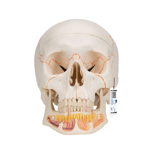• Este cráneo didáctico presenta las suturas craneales diferenciadas por color, facilitando el estudio de sus límites y relaciones anatómicas. Ofrece una reproducción muy exacta del cráneo humano, con gran precisión en surcos, orificios, apófisis y suturas. Está fabricado y terminado manualmente en un material resistente e irrompible y es desmontable en bóveda craneal, base del cráneo y mandíbula. De manera opcional puede integrarse un cerebro TB1000226 de 5 piezas. Incluye acceso al gemelo digital en smartphone, tablet o computadora. Dimensiones: 20 x 13,5 x 15,5 cm.