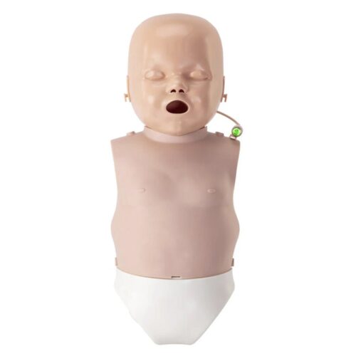 Maniquí simulador de bebé para prácticas varias de cuidados de emergencia. Simula en tamaño, peso y apariencia real a un bebé de 9 meses de edad. Permite la inserción de tubo bilateral, desfibrilación con descarga de 2 – 4 Joules por kg, inserción de tubo ET, cuidado del catéter de alimentación, inserción de sonda Foley (femenino). Cuenta con punteos de inyección intramuscular y subcutánea, pierna para acceso interóseo, colocación de sonda nasogástrica con depósito, puntos periféricos IV en mano y pie, inserción de dispositivo CCIP, y la inserción de MLA. Permite simular edema de lengua, laringoespasmo, y neumotórax. Permite, además, la inserción de medicinas vía rectal. Cuenta con 6 puntos de pulso: 2 braquiales, 2 femorales, 2 carotídeos. -